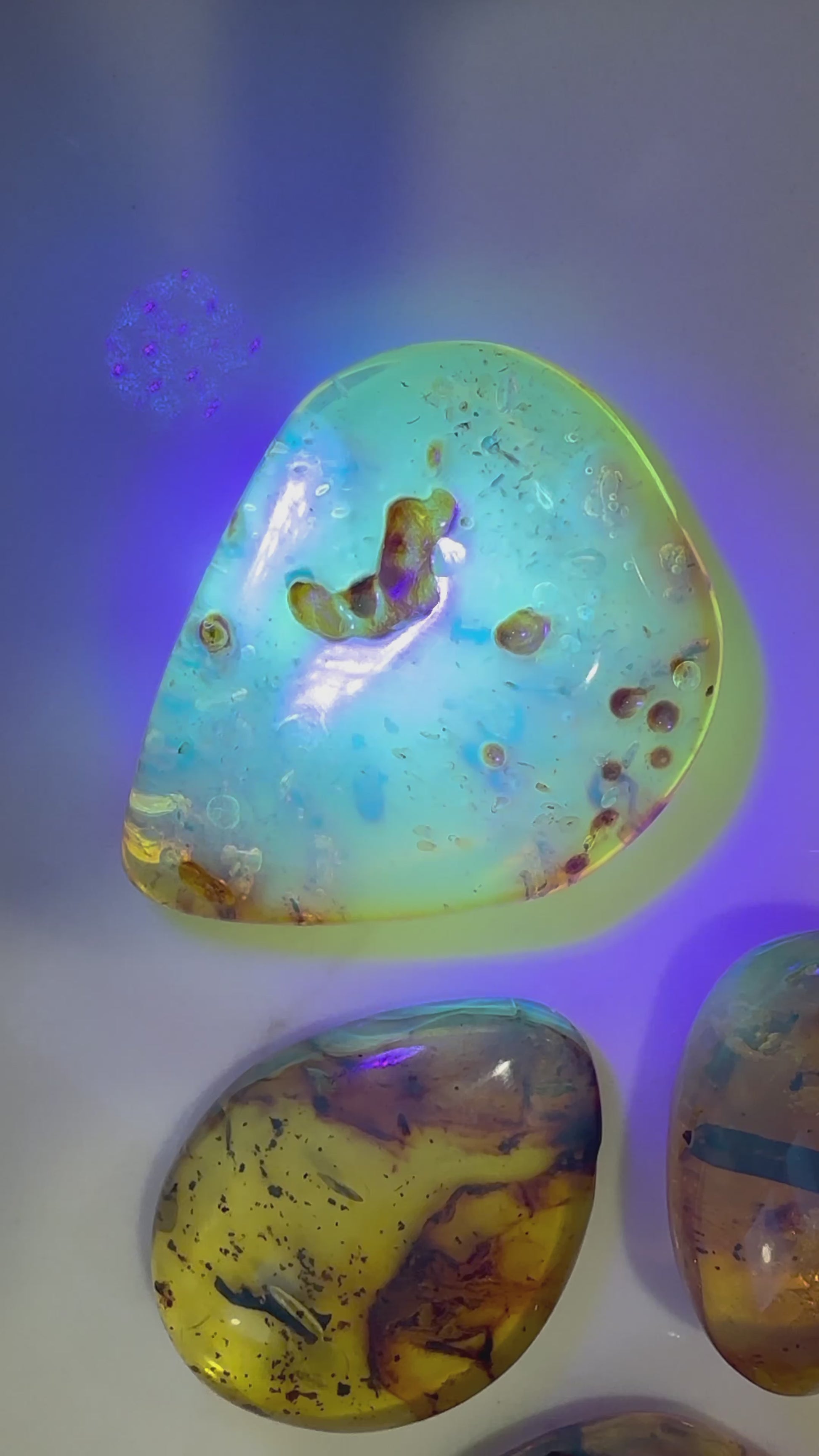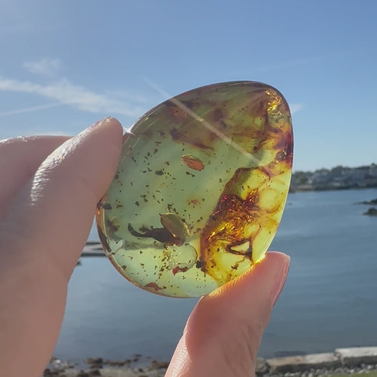 Amber is created from fossilized resin of extinct tree trunks. This beautiful, UV-reactive piece dates back to the early Miocene Era (approximately 20 million years ago)!