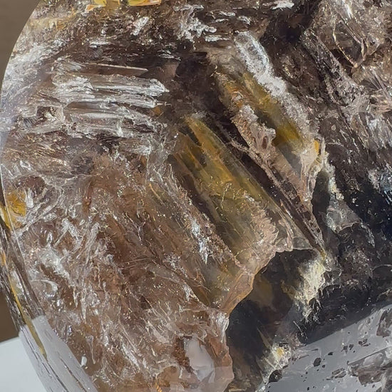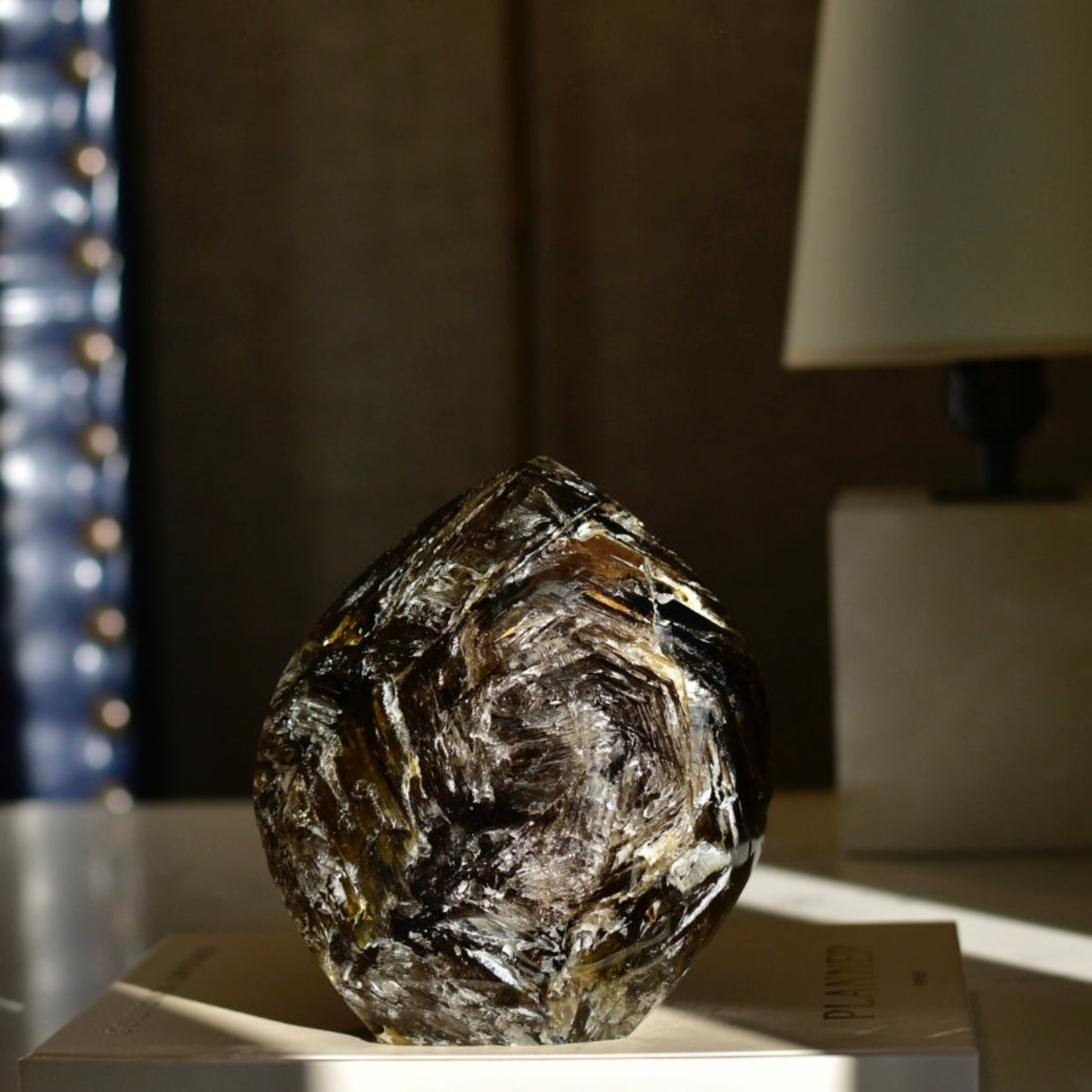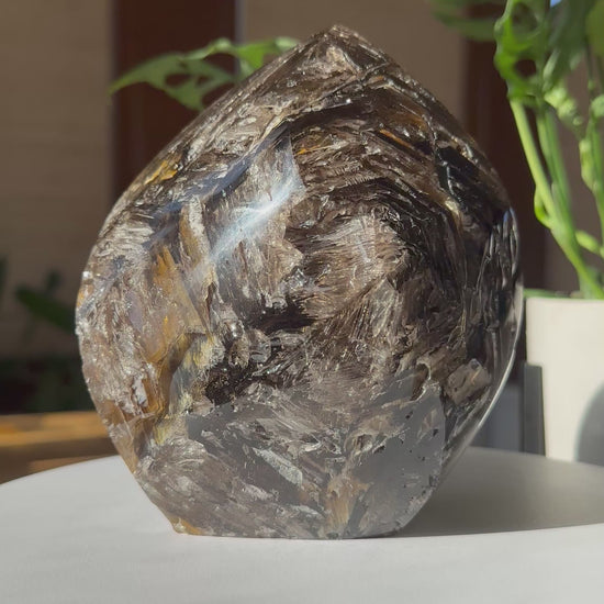 Beautiful polished Elestial Quartz flame from Minas Gerais, Brazil. This incredible crystal will keep you mesmerized for hours! With layers of depth, stunning inclusions, and rich, moody coloring, this piece is a masterpiece in and of itself.